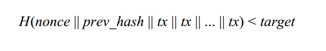 比特币的工作证明就是hash puzzles。为了创建一个区块,节点需要能够找到一个数值:nonce,使得当计算哈希时,前一个hash,包含在区块中的交易,以及 nonce 这三者连接之后,它的哈希值小于某个 target。